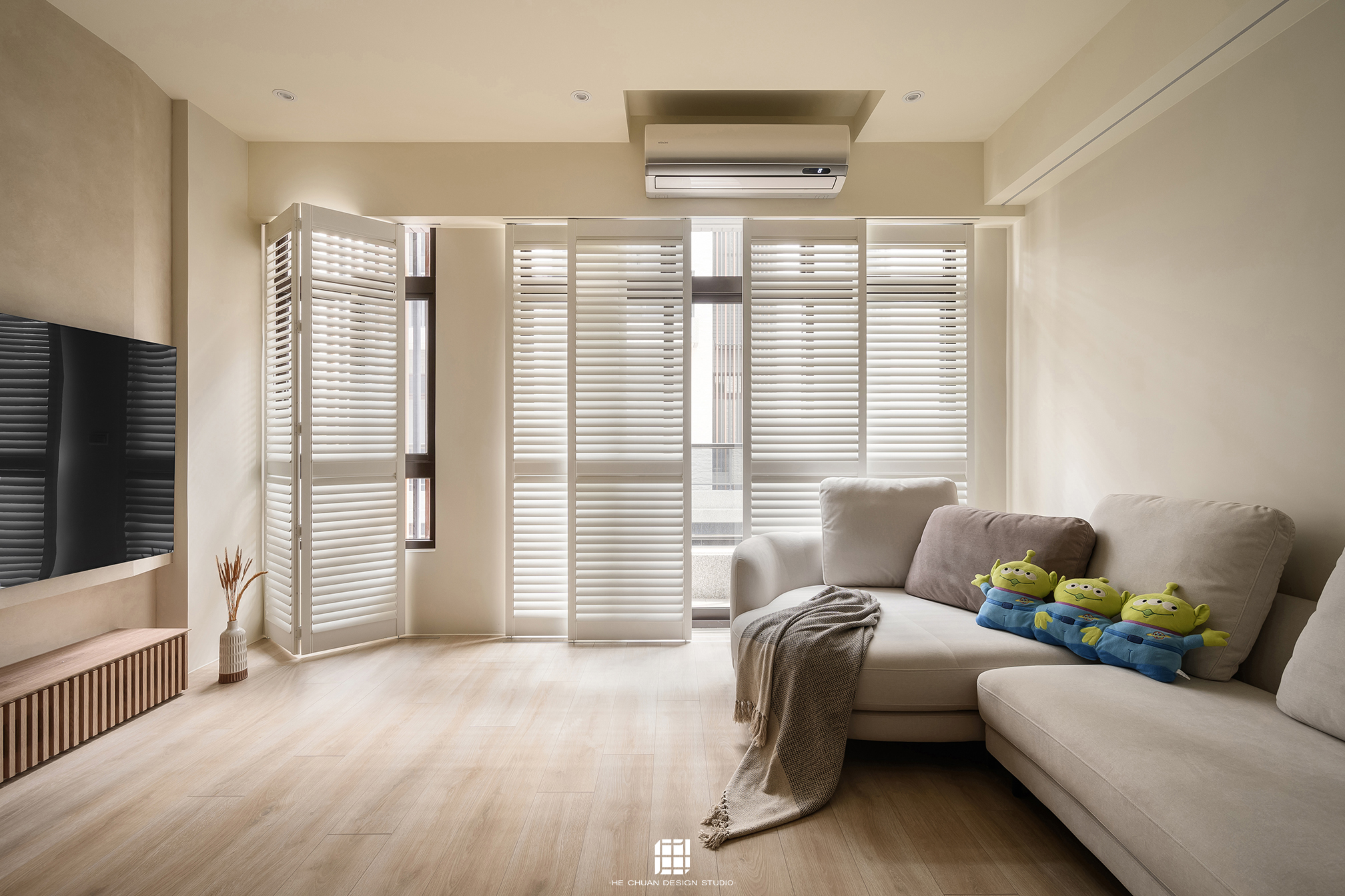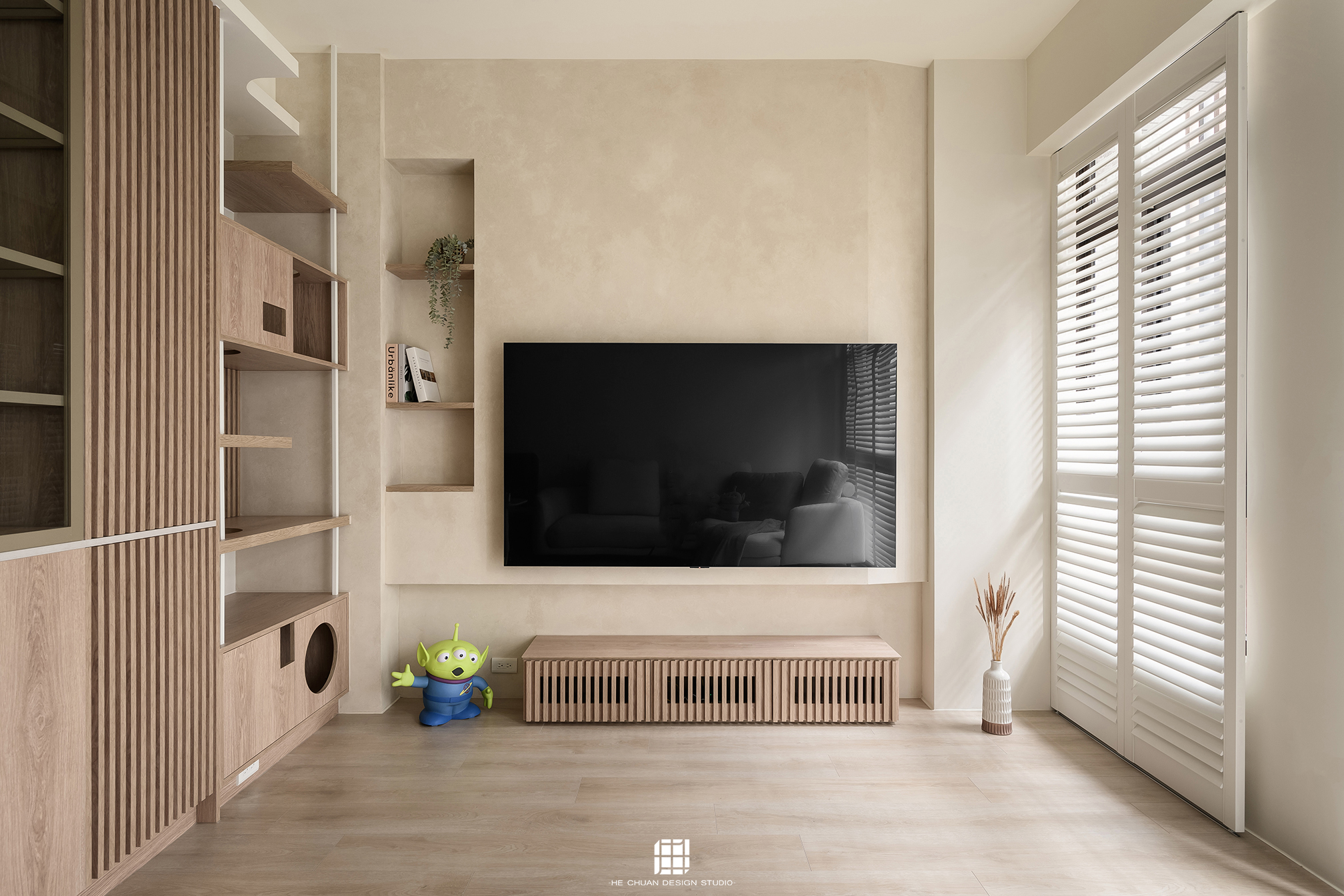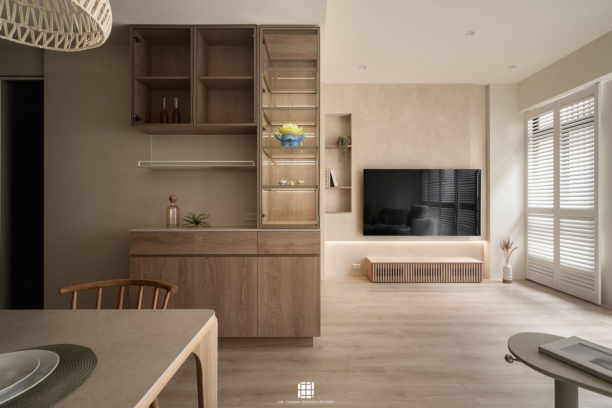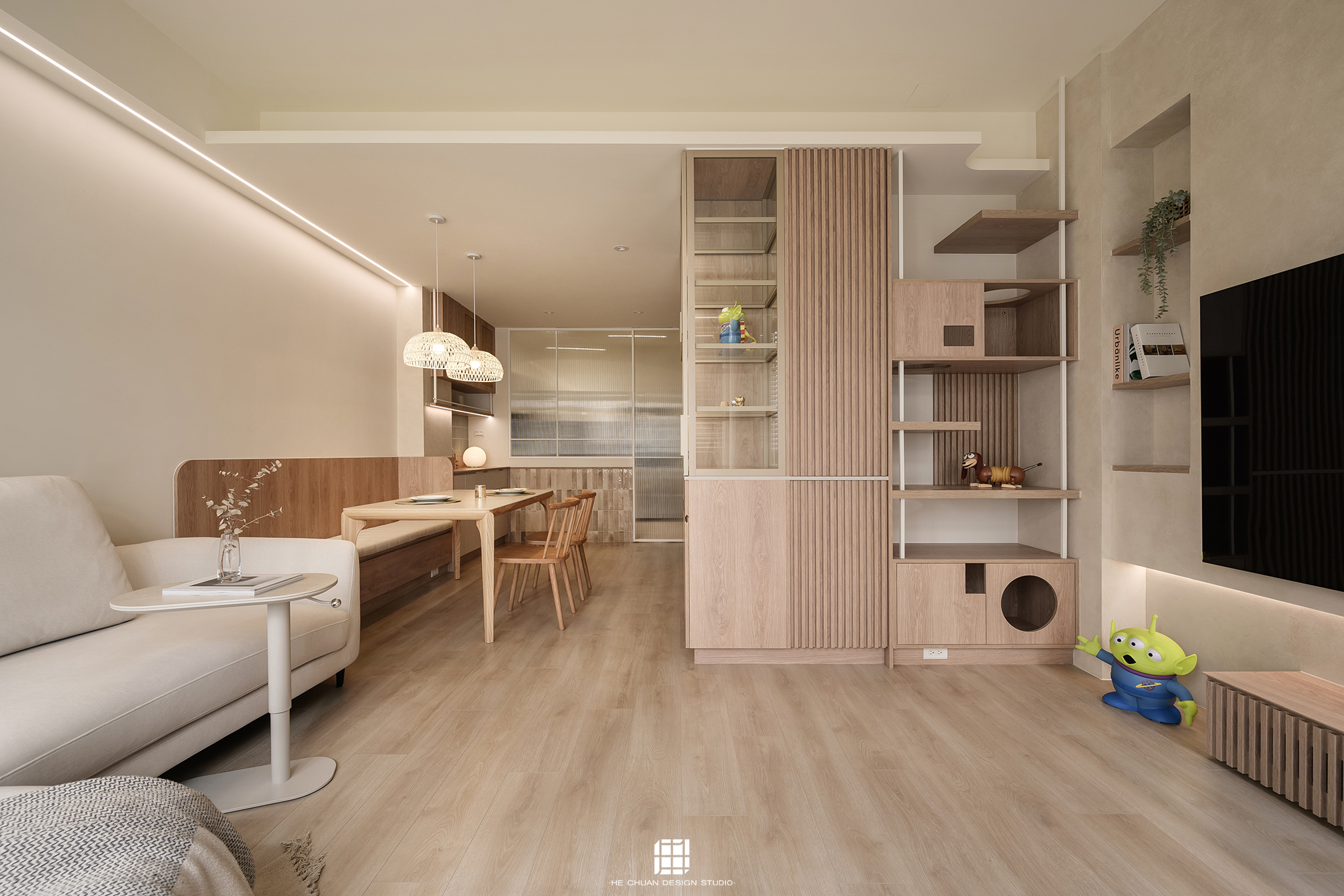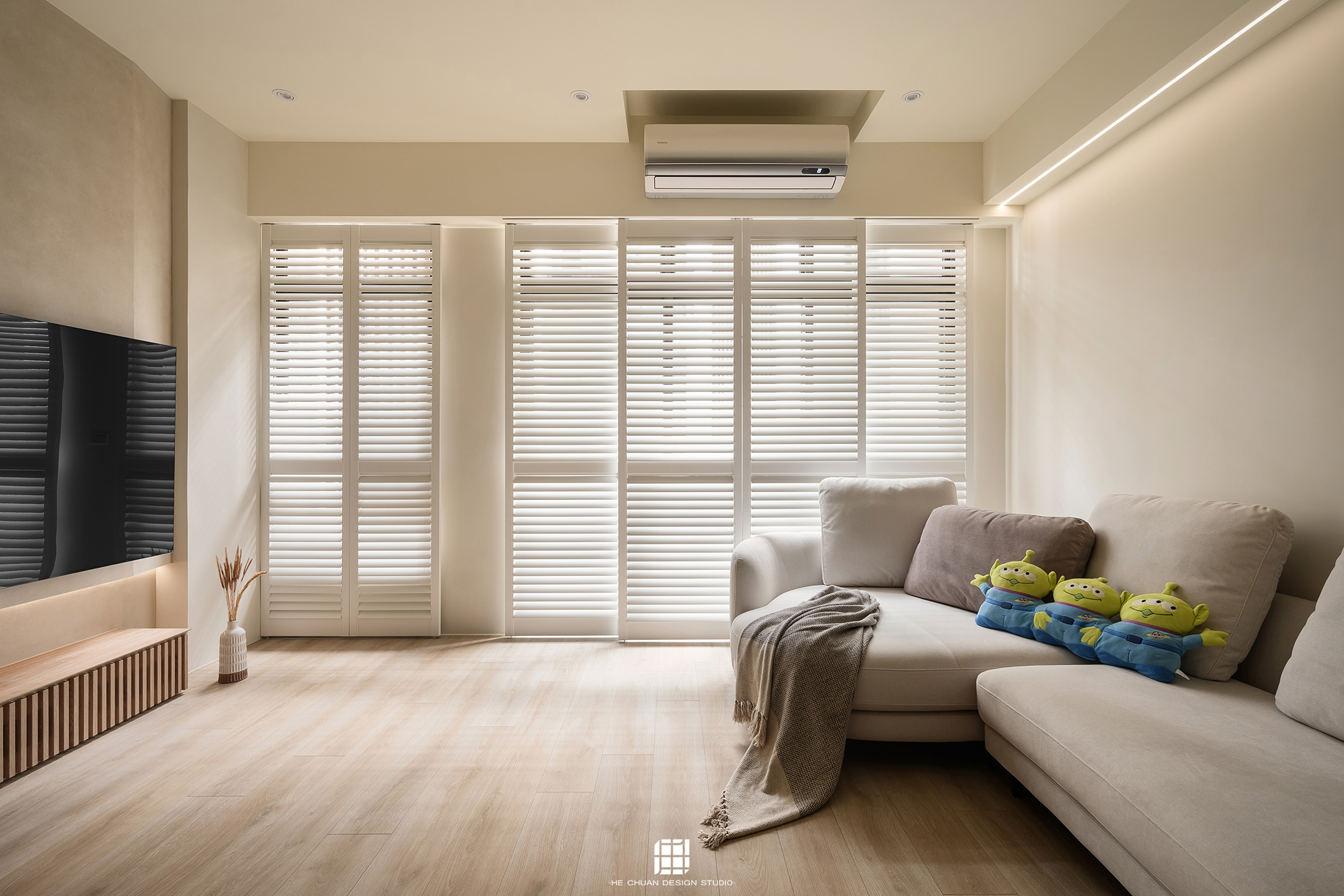 「蒔」意為栽種。本案以此為核心概念,將光線、材質與生活感受,緩緩蒔入空間之中。整體以淺木色為基底,搭配奶油白與低彩度色階,建立溫潤且柔和的居住氛圍。木質紋理的自然肌理,承載生活的時間感;留白牆面則讓視覺得以呼吸,形塑乾淨而純粹的空間語彙。公領域採開放式配置,讓日光自窗邊延展至室內深處。光線在木質與織品表面流動,隨時間推移產生細膩層次,使空間在不同時段呈現不同表情。材質選擇上,以溫潤觸感與自然質地為優先,減少過度裝飾,回歸生活本質。角落裡點綴的公仔與小物,如同一顆顆被蒔下的星星,悄然構築屬於屋主的私密宇宙。童心與日常在此共存,理性配置之中保留柔軟餘地。