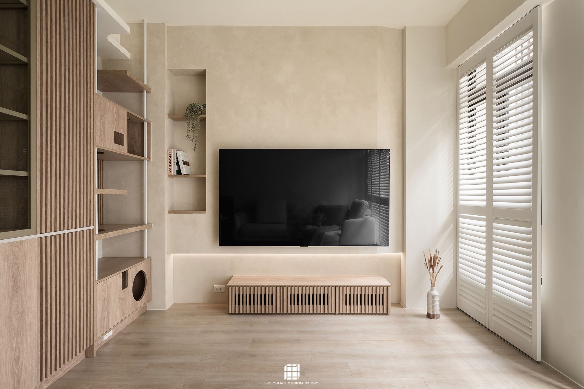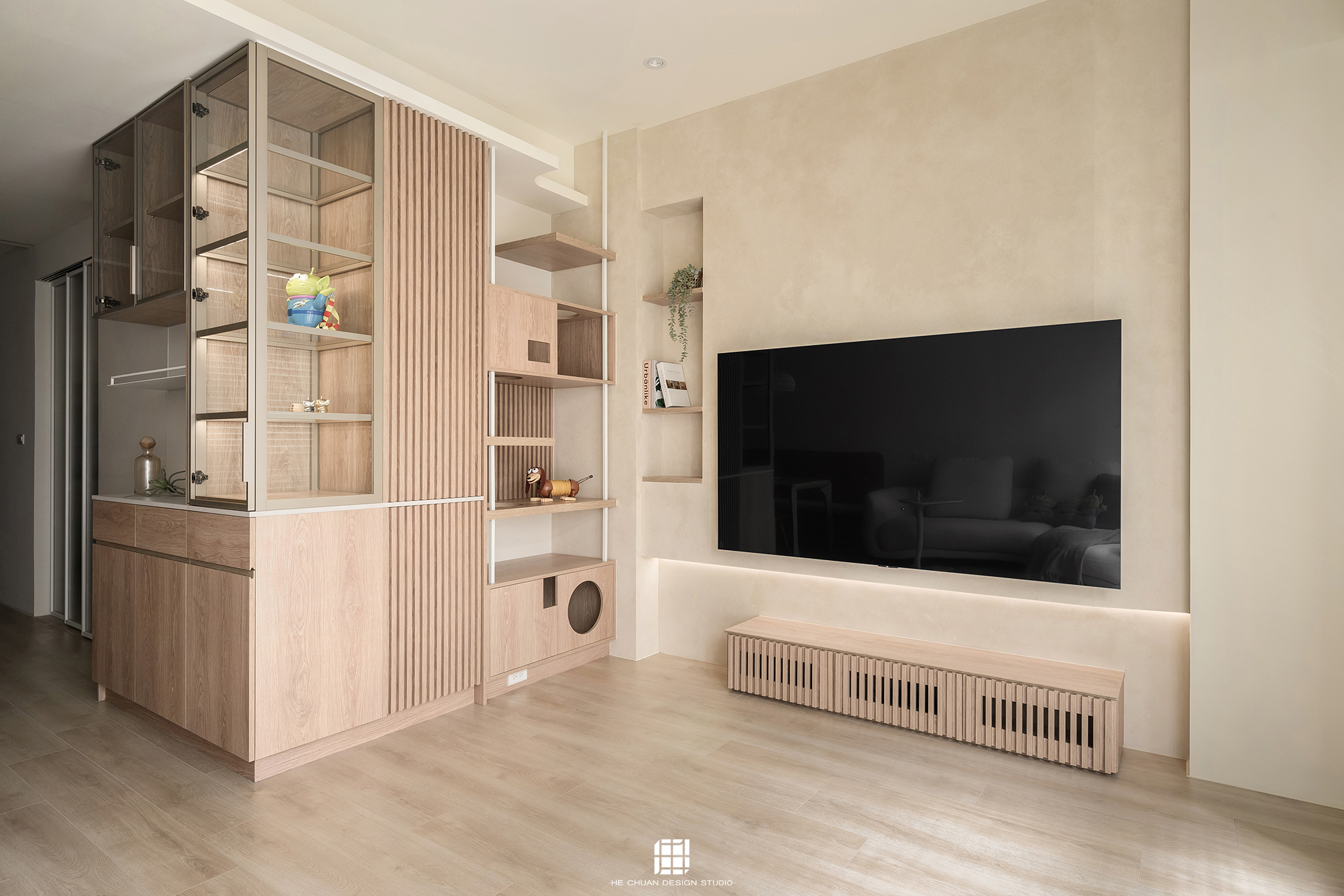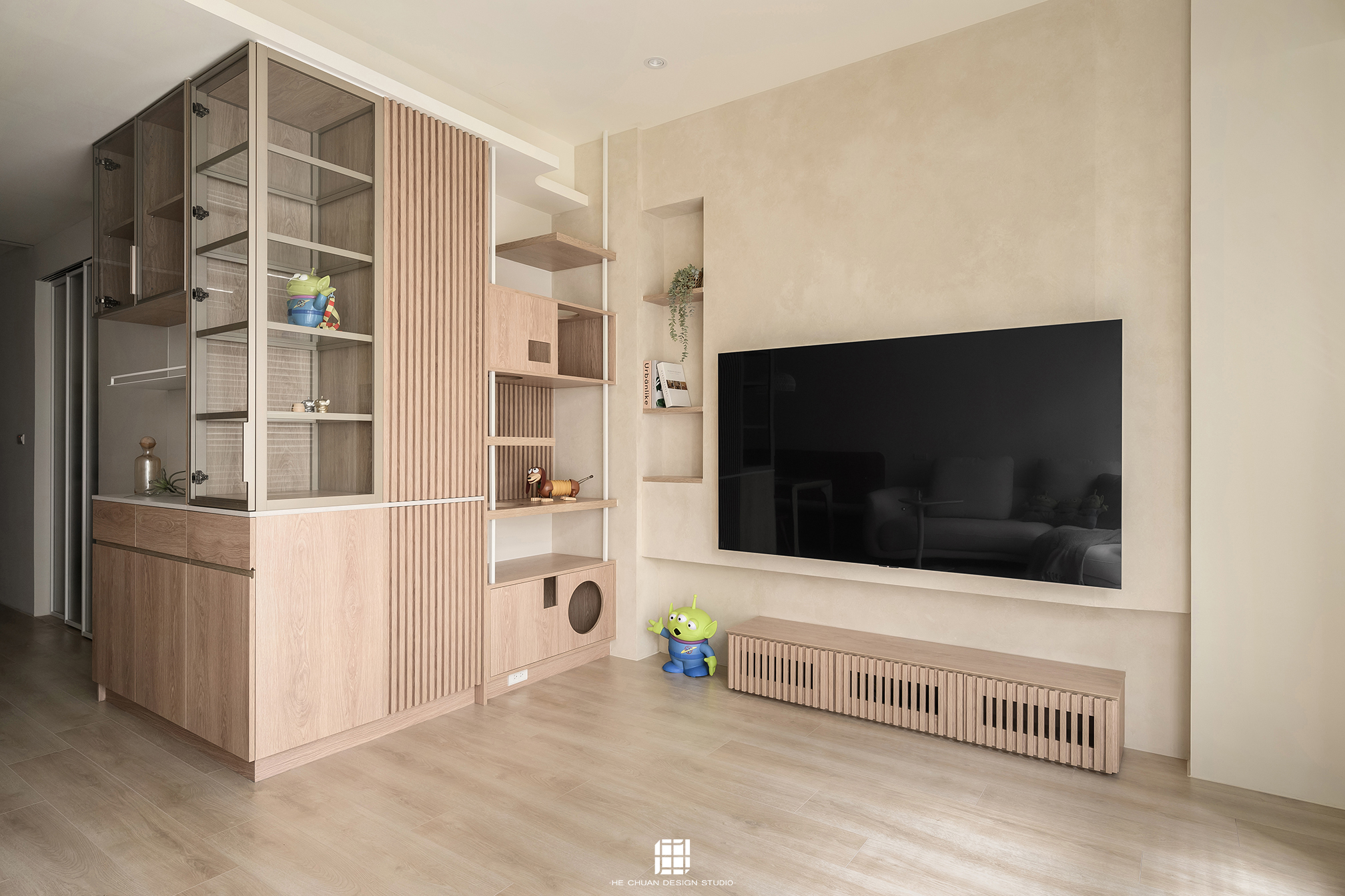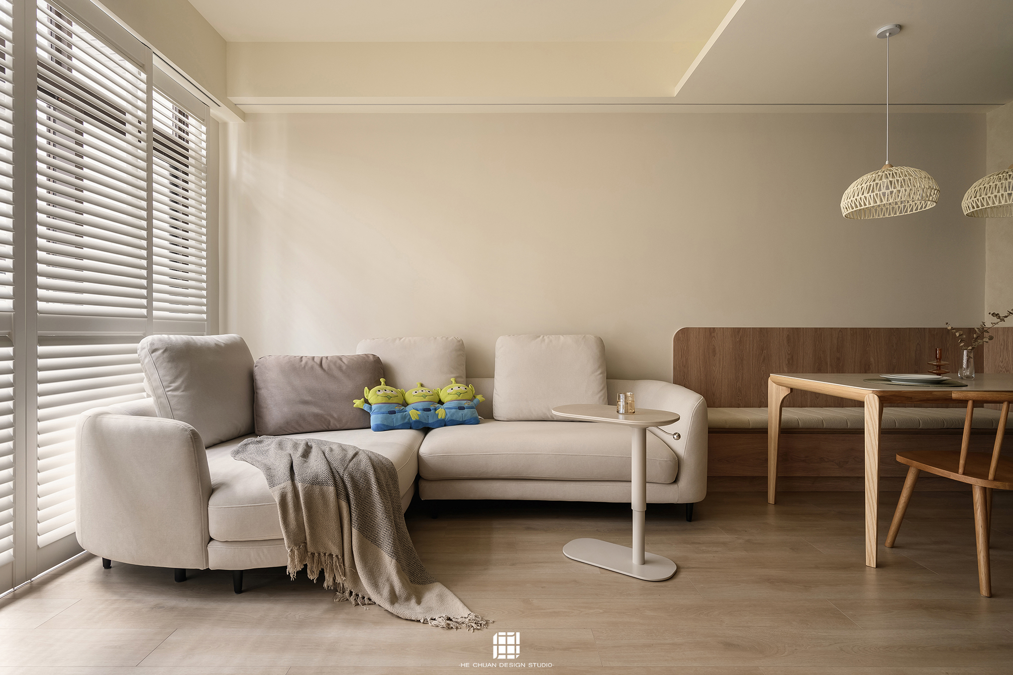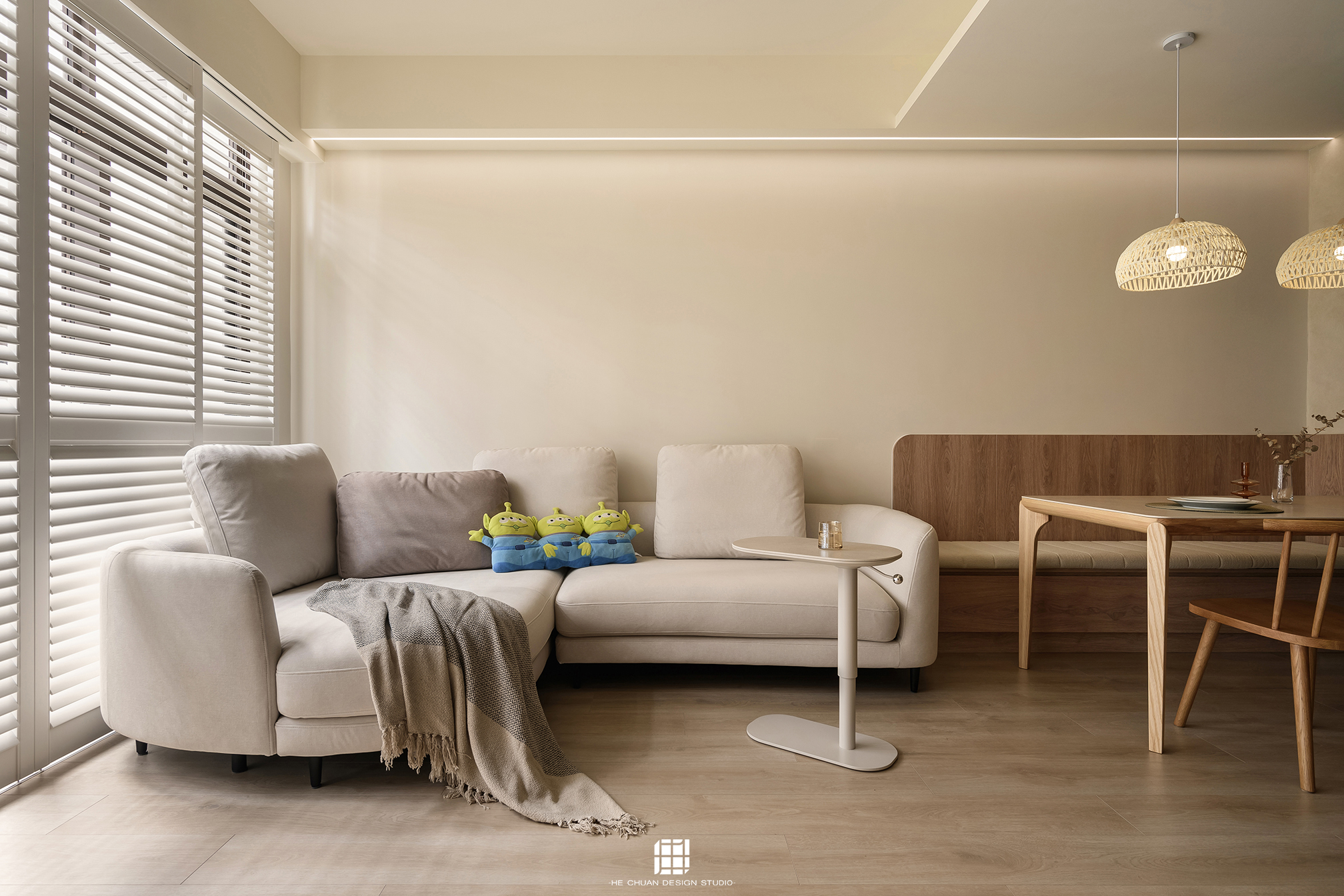 「蒔」意為栽種。本案以此為核心概念,將光線、材質與生活感受,緩緩蒔入空間之中。整體以淺木色為基底,搭配奶油白與低彩度色階,建立溫潤且柔和的居住氛圍。木質紋理的自然肌理,承載生活的時間感;留白牆面則讓視覺得以呼吸,形塑乾淨而純粹的空間語彙。公領域採開放式配置,讓日光自窗邊延展至室內深處。光線在木質與織品表面流動,隨時間推移產生細膩層次,使空間在不同時段呈現不同表情。材質選擇上,以溫潤觸感與自然質地為優先,減少過度裝飾,回歸生活本質。角落裡點綴的公仔與小物,如同一顆顆被蒔下的星星,悄然構築屬於屋主的私密宇宙。童心與日常在此共存,理性配置之中保留柔軟餘地。
