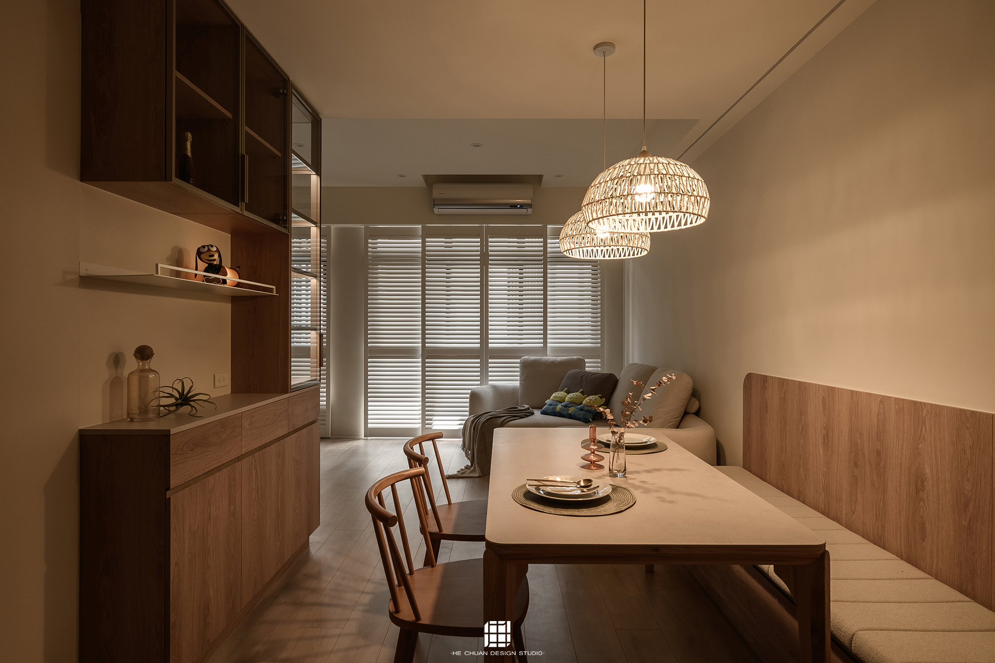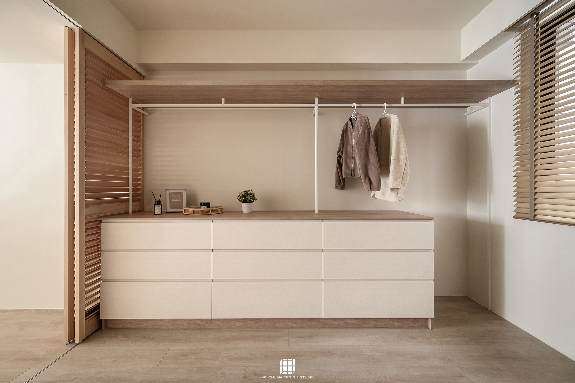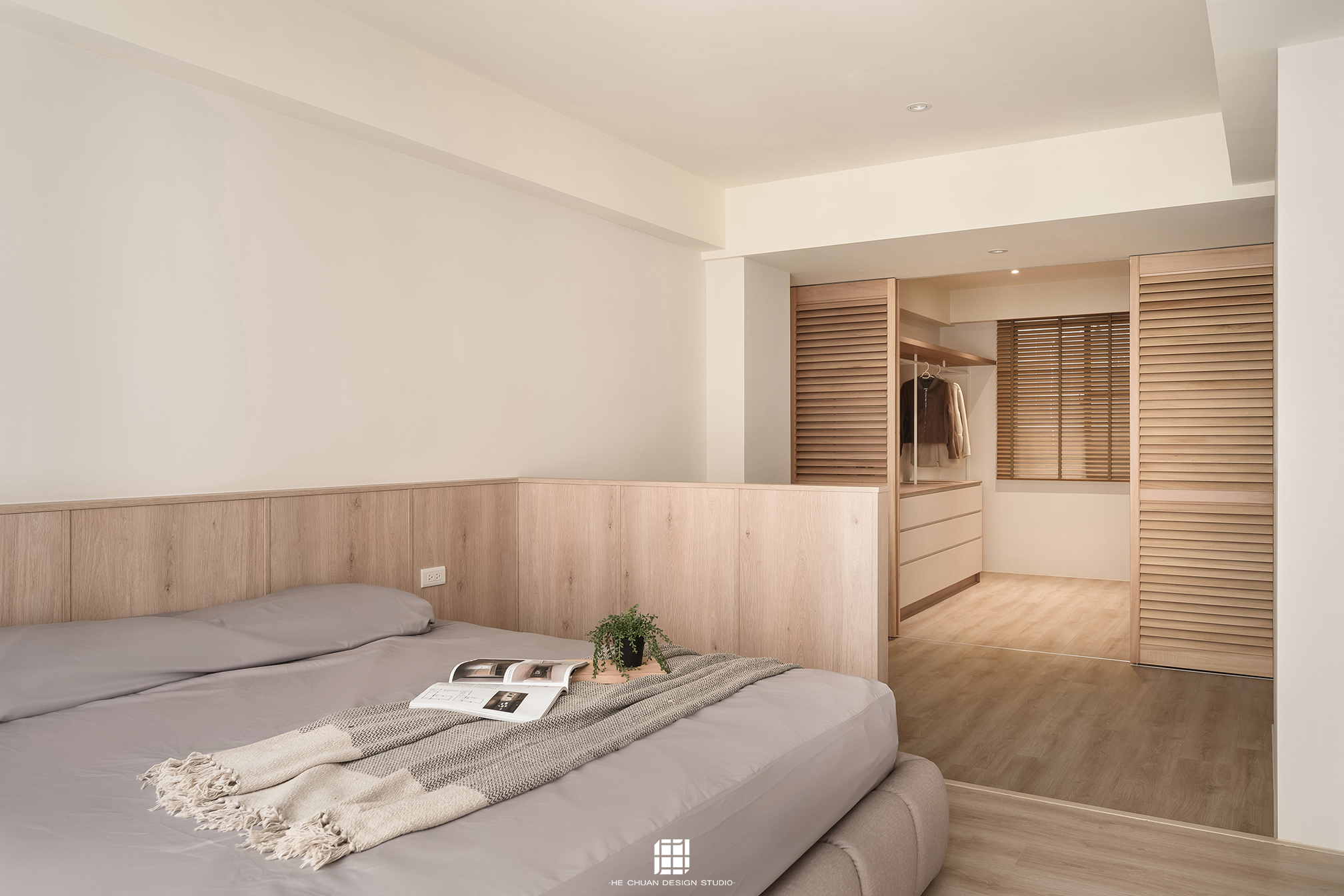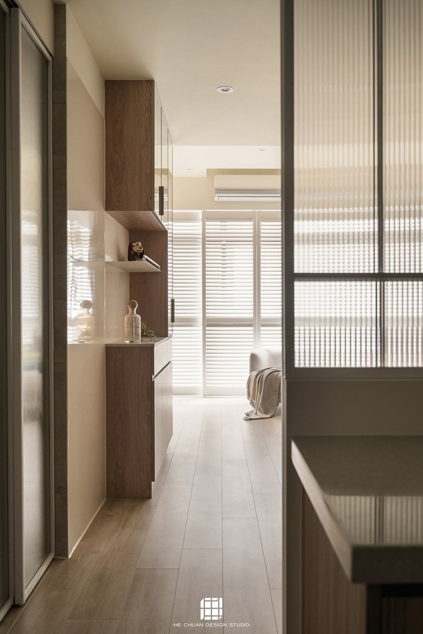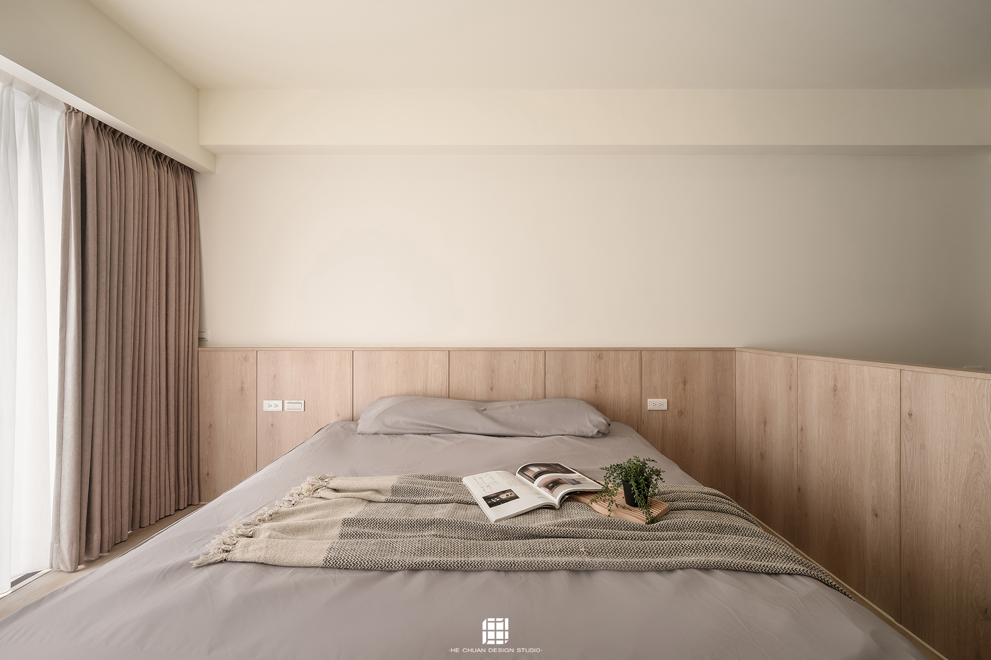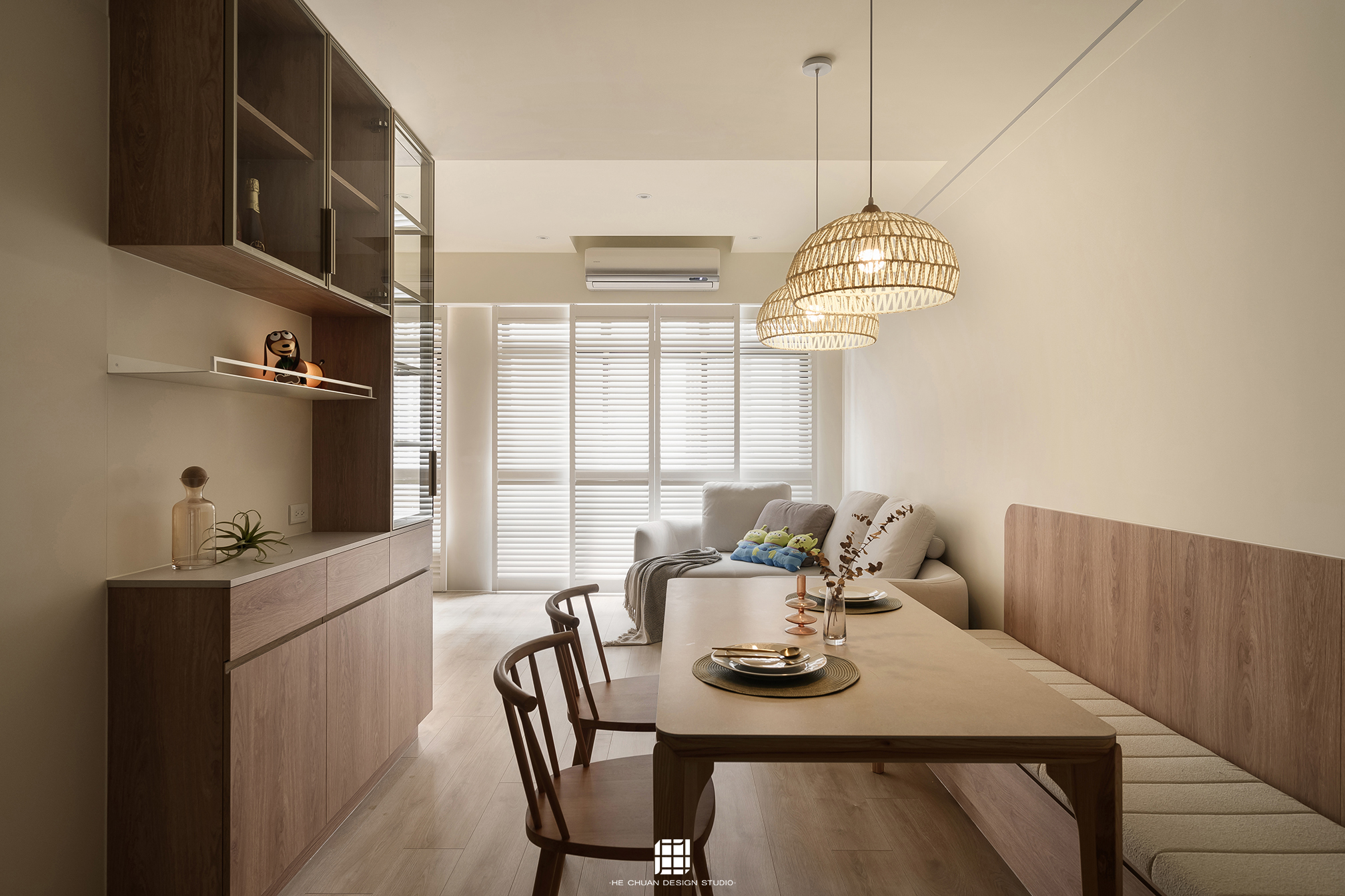 「蒔」意為栽種。本案以此為核心概念,將光線、材質與生活感受,緩緩蒔入空間之中。整體以淺木色為基底,搭配奶油白與低彩度色階,建立溫潤且柔和的居住氛圍。木質紋理的自然肌理,承載生活的時間感;留白牆面則讓視覺得以呼吸,形塑乾淨而純粹的空間語彙。公領域採開放式配置,讓日光自窗邊延展至室內深處。光線在木質與織品表面流動,隨時間推移產生細膩層次,使空間在不同時段呈現不同表情。材質選擇上,以溫潤觸感與自然質地為優先,減少過度裝飾,回歸生活本質。角落裡點綴的公仔與小物,如同一顆顆被蒔下的星星,悄然構築屬於屋主的私密宇宙。童心與日常在此共存,理性配置之中保留柔軟餘地。