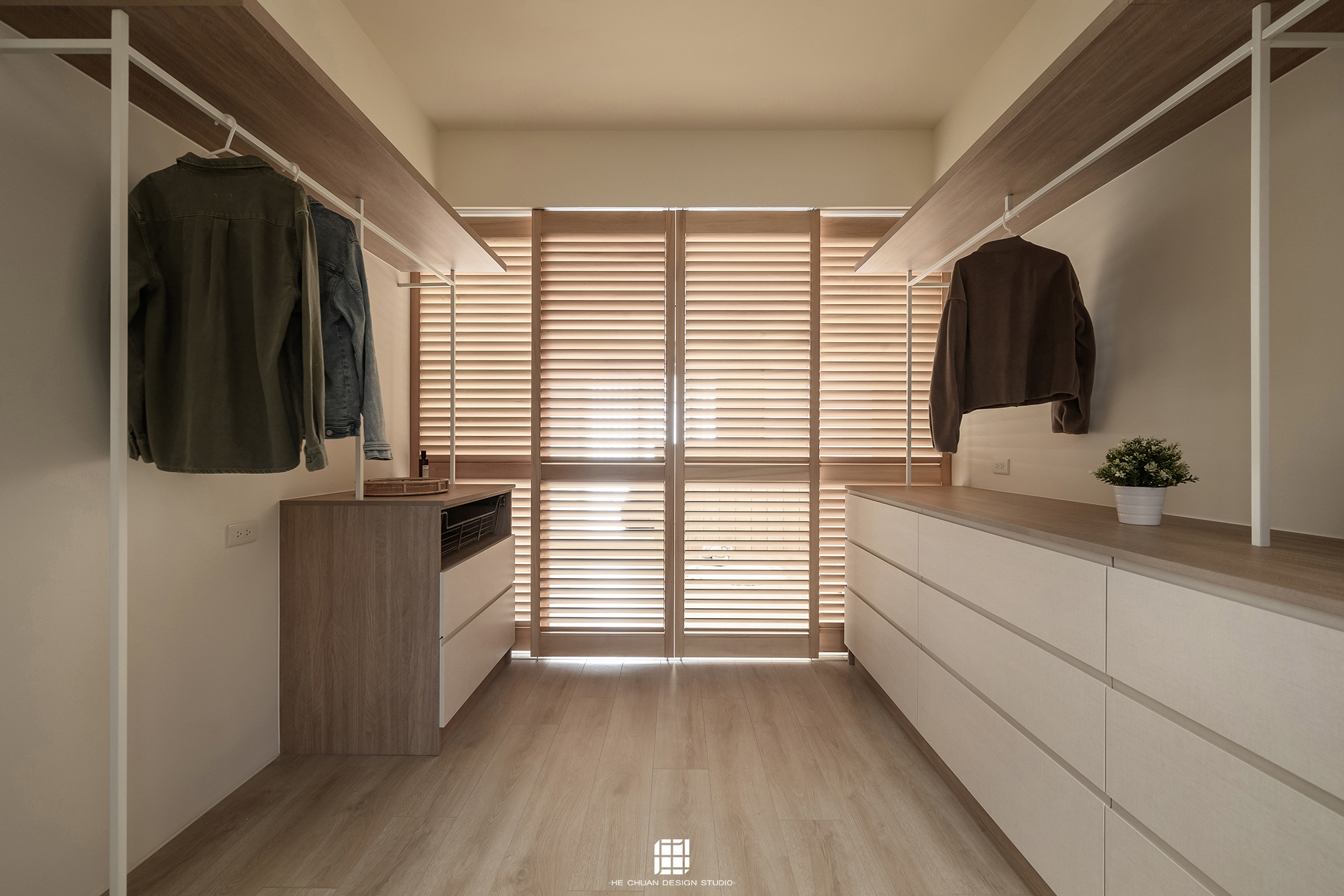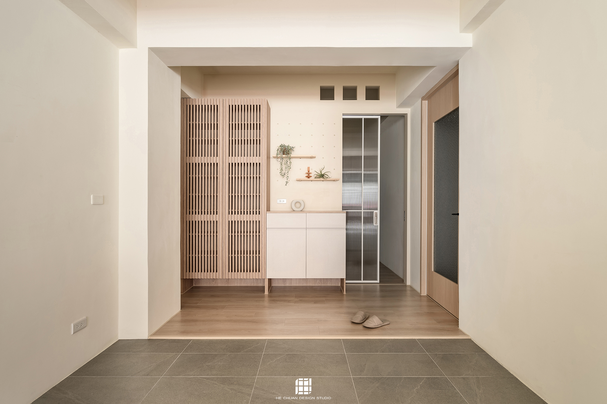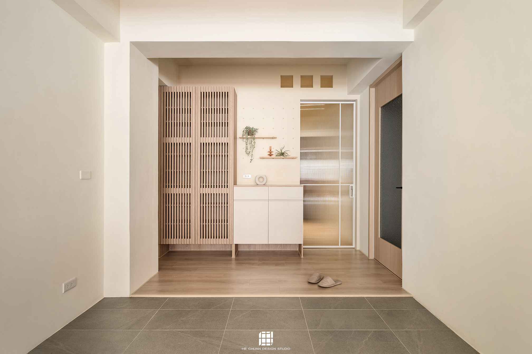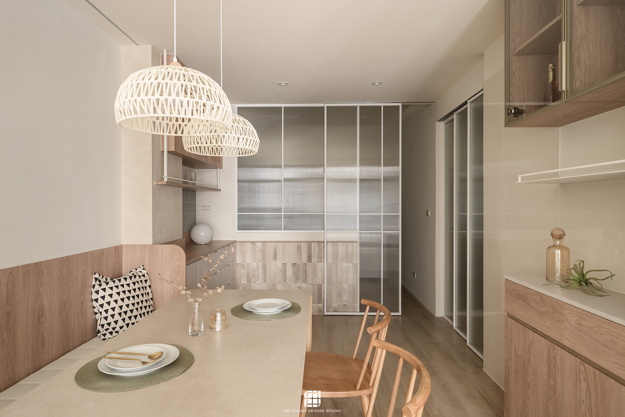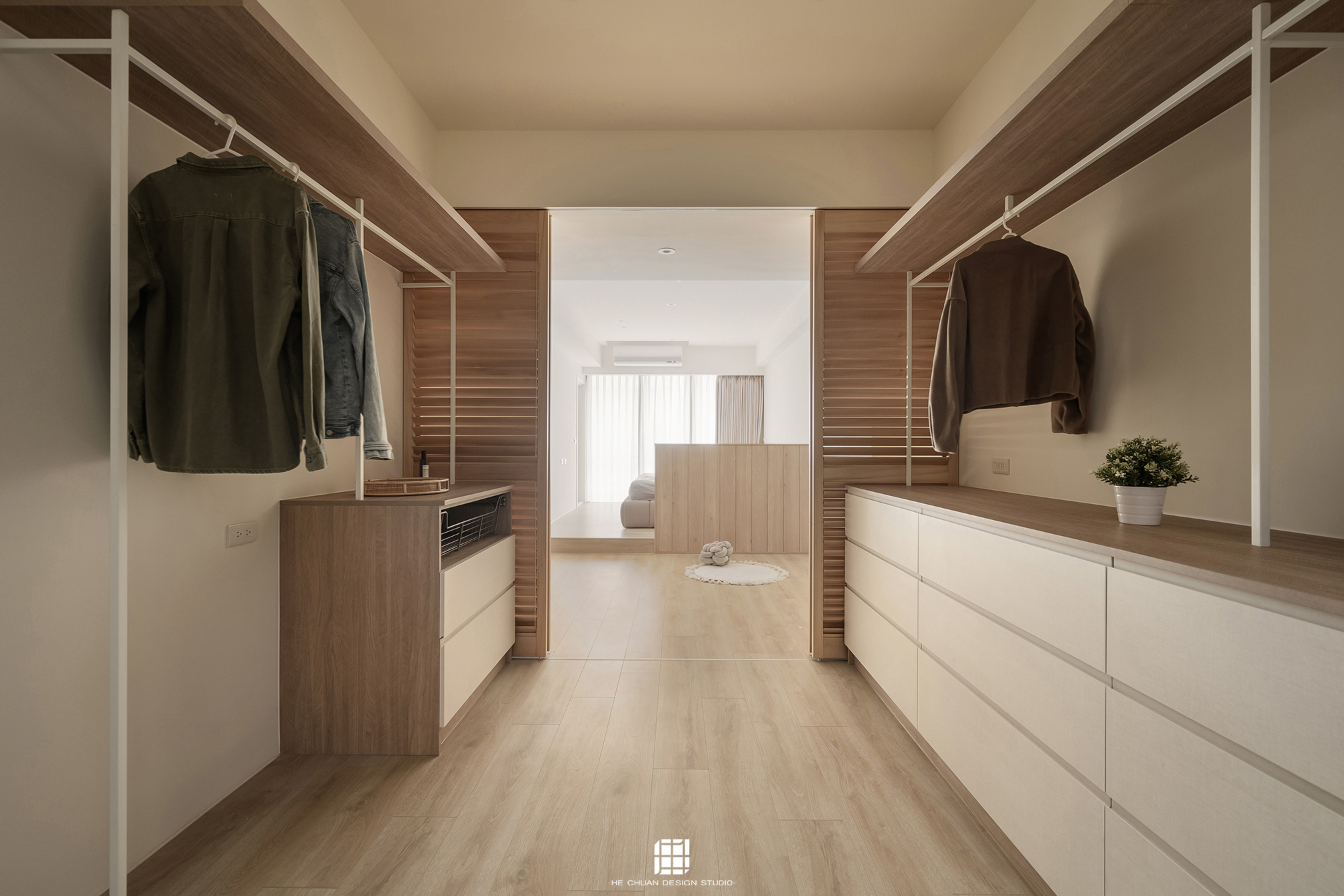 「蒔」意為栽種。本案以此為核心概念,將光線、材質與生活感受,緩緩蒔入空間之中。整體以淺木色為基底,搭配奶油白與低彩度色階,建立溫潤且柔和的居住氛圍。木質紋理的自然肌理,承載生活的時間感;留白牆面則讓視覺得以呼吸,形塑乾淨而純粹的空間語彙。公領域採開放式配置,讓日光自窗邊延展至室內深處。光線在木質與織品表面流動,隨時間推移產生細膩層次,使空間在不同時段呈現不同表情。材質選擇上,以溫潤觸感與自然質地為優先,減少過度裝飾,回歸生活本質。角落裡點綴的公仔與小物,如同一顆顆被蒔下的星星,悄然構築屬於屋主的私密宇宙。童心與日常在此共存,理性配置之中保留柔軟餘地。